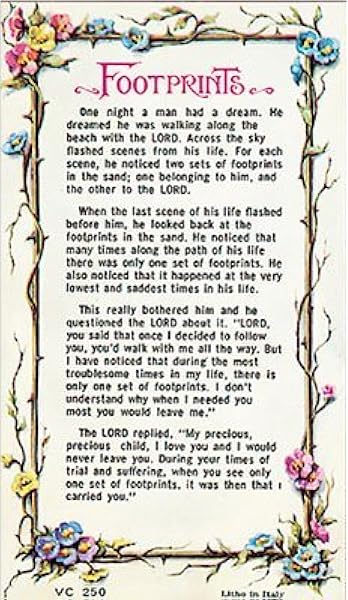 Our gethsemani way prayer for addictions nights are open to all including those in recovery, loved ones, and friends praying for individuals struggling with this disease. I first heard the footprints poem, when i was visiting a new widow. Learn more about the meaning of the footprints prayer. This listing is for a printable instant download of this artwork in jpeg format. Prayer does not appear in the bible, some believe that it's based on scripture. As i was walking along the beach with my lord. When the last scene of my life flashed before me, i looked back at the footprints in the sand. Footprints in the sand is a beautiful christian poem about having faith in god even when times are tough. Enjoy the inspirational words of the footprints prayer. Footprints in the sand, prayer card. I noticed that at many times along the path of my life, especially at the very lowest and saddest times, there was only one set of footprints. Footprints in the sand verse prayer card in plastic wallet 3 1/4 x 5 el £1.66. Many believers are even convinced that the poem is a bible scripture.